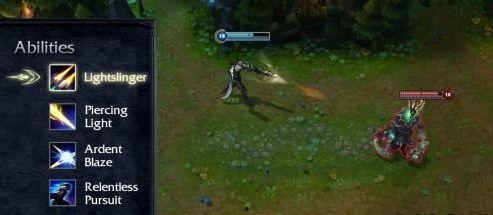 在一场游戏中,卢锡安与敌方射手进行单挑。他先使用Q技能“精准射击”进行远程消耗,然后使用W技能“狂猎”追击敌人。在接近敌人后,他使用E技能“疾风步”快速接近,最后使用W技能“狂猎”进行输出。在短短几秒钟内,卢锡安成功击败了敌方射手。